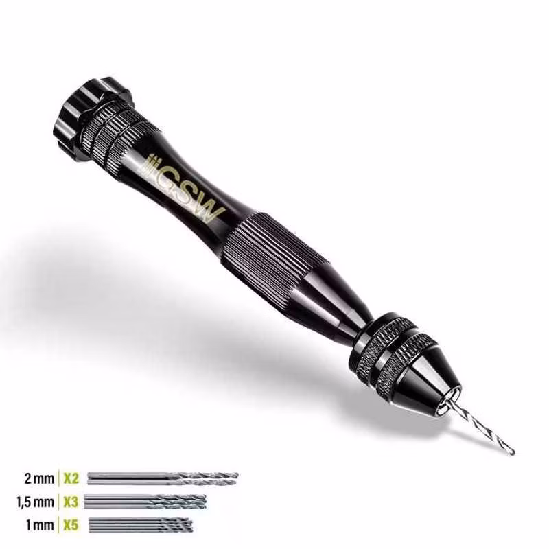 This type of hand drill or Pin Vise is especially useful for hobbyists and enthusiasts who work with models, miniatures, and other small projects. The compact size and precise control make it an ideal tool for creating tiny perforations and holes in a variety of materials, including plastic, resin, wood, and metal.
