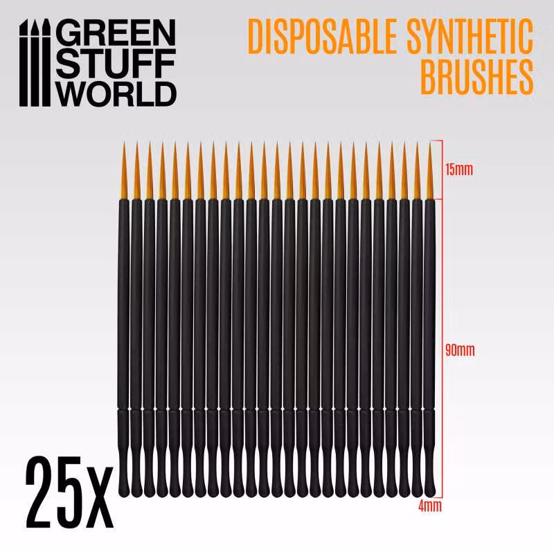 Pack of 25 mini synthetic brushes with a sturdy plastic handle. They may be used for one-time tasks which might damage your main brushes, or to simply have plenty of fresh brushes at hand.