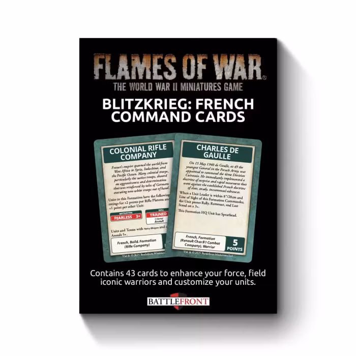 The Blitzkrieg French Command Card pack contains 43 Command Cards to enhance your force, field iconic warriors and customize your units!